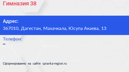 Гимназия №38 по адресу 367010, Дагестан, Махачкала, Юсупа Акаева, 13 в дальнейшем Организация, размещена в следующих категориях: