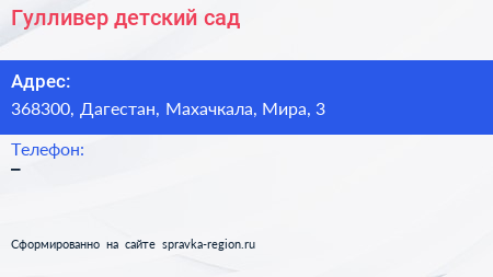 Гулливер, детский сад по адресу 368300, Дагестан, Махачкала, Мира, 3 в дальнейшем Организация, размещена в следующих категориях:
