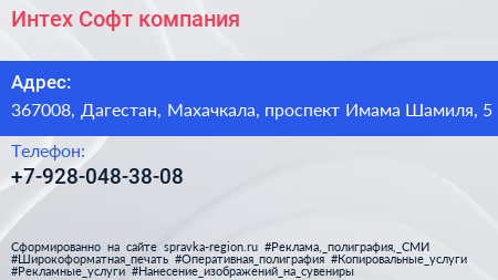 Интех-Софт, компания по адресу 367008, Дагестан, Махачкала, проспект Имама Шамиля, 5 в дальнейшем Организация, размещена в следующих категориях: