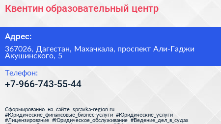 Квентин, образовательный центр по адресу 367026, Дагестан, Махачкала, проспект Али-Гаджи Акушинского, 5 в дальнейшем Организация, размещена в следующих категориях: