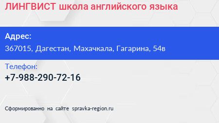 ЛИНГВИСТ, школа английского языка по адресу 367015, Дагестан, Махачкала, Гагарина, 54в в дальнейшем Организация, размещена в следующих категориях:
