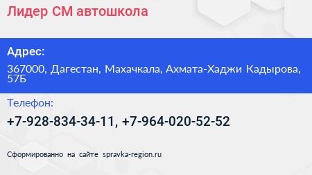 Лидер СМ, автошкола по адресу 367000, Дагестан, Махачкала, Ахмата-Хаджи Кадырова, 57Б в дальнейшем Организация, размещена в следующих категориях: