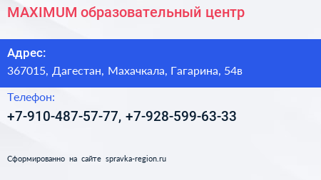 MAXIMUM, образовательный центр по адресу 367015, Дагестан, Махачкала, Гагарина, 54в в дальнейшем Организация, размещена в следующих категориях: