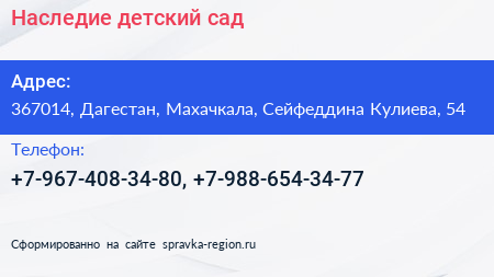 Наследие, детский сад по адресу 367014, Дагестан, Махачкала, Сейфеддина Кулиева, 54 в дальнейшем Организация, размещена в следующих категориях: