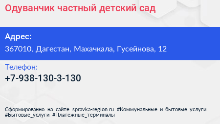 Одуванчик, частный детский сад по адресу 367010, Дагестан, Махачкала, Гусейнова, 12 в дальнейшем Организация, размещена в следующих категориях:
