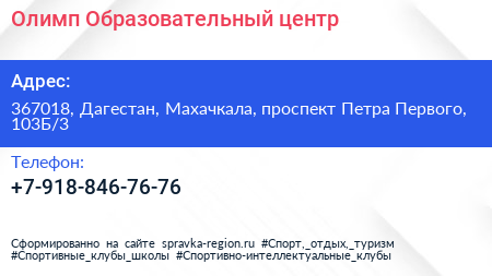 Олимп, Образовательный центр по адресу 367018, Дагестан, Махачкала, проспект Петра Первого, 103Б/3 в дальнейшем Организация, размещена в следующих категориях: