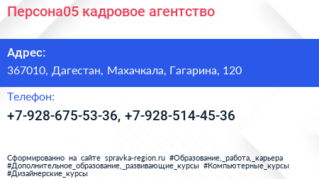 Персона05, кадровое агентство по адресу 367010, Дагестан, Махачкала, Гагарина, 120 в дальнейшем Организация, размещена в следующих категориях: