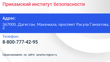Прикамский институт безопасности по адресу 367000, Дагестан, Махачкала, проспект Расула Гамзатова, 2 в дальнейшем Организация, размещена в следующих категориях: