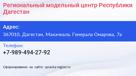 Региональный модельный центр Республики Дагестан по адресу 367010, Дагестан, Махачкала, Генерала Омарова, 7а в дальнейшем Организация, размещена в следующих категориях: