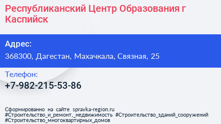 Республиканский Центр Образования, г. Каспийск по адресу 368300, Дагестан, Махачкала, Связная, 25 в дальнейшем Организация, размещена в следующих категориях:
