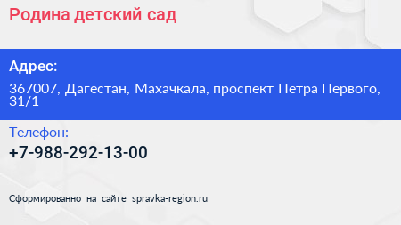 Родина, детский сад по адресу 367007, Дагестан, Махачкала, проспект Петра Первого, 31/1 в дальнейшем Организация, размещена в следующих категориях: