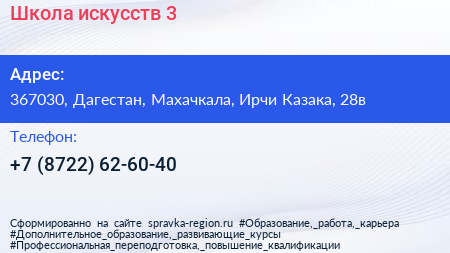 Школа искусств №3 по адресу 367030, Дагестан, Махачкала, Ирчи Казака, 28в в дальнейшем Организация, размещена в следующих категориях: