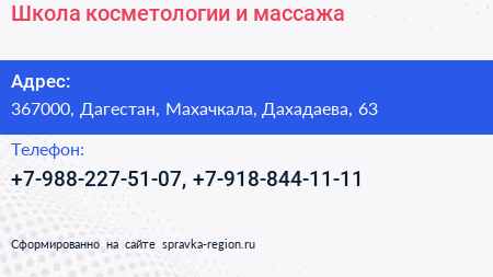 Школа косметологии и массажа по адресу 367000, Дагестан, Махачкала, Дахадаева, 63 в дальнейшем Организация, размещена в следующих категориях: