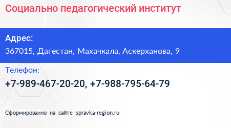 Социально-педагогический институт по адресу 367015, Дагестан, Махачкала, Аскерханова, 9 в дальнейшем Организация, размещена в следующих категориях: