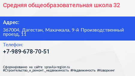 Средняя общеобразовательная школа №32 по адресу 367004, Дагестан, Махачкала, 9-й Производственный проезд, 11 в дальнейшем Организация, размещена в следующих категориях: