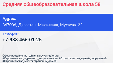Средняя общеобразовательная школа №58 по адресу 367006, Дагестан, Махачкала, Мусаева, 22 в дальнейшем Организация, размещена в следующих категориях:
