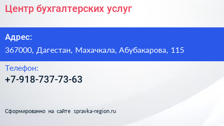 Центр бухгалтерских услуг по адресу 367000, Дагестан, Махачкала, Абубакарова, 115 в дальнейшем Организация, размещена в следующих категориях: