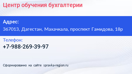 Центр обучения бухгалтерии по адресу 367013, Дагестан, Махачкала, проспект Гамидова, 18р в дальнейшем Организация, размещена в следующих категориях: