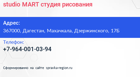 studio MART, студия рисования по адресу 367000, Дагестан, Махачкала, Дзержинского, 17Б в дальнейшем Организация, размещена в следующих категориях: