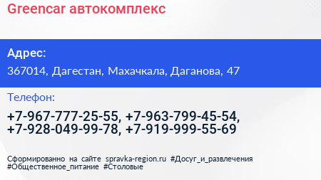 Greencar, автокомплекс по адресу 367014, Дагестан, Махачкала, Даганова, 47 в дальнейшем Организация, размещена в следующих категориях: