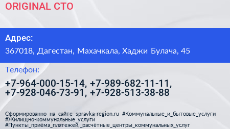 ORIGINAL, СТО по адресу 367018, Дагестан, Махачкала, Хаджи Булача, 45 в дальнейшем Организация, размещена в следующих категориях: