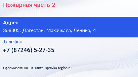 Пожарная часть №2 по адресу 368305, Дагестан, Махачкала, Ленина, 4 в дальнейшем Организация, размещена в следующих категориях: