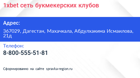 1xbet, сеть букмекерских клубов по адресу 367029, Дагестан, Махачкала, Абдулхакима Исмаилова, 21д в дальнейшем Организация, размещена в следующих категориях: