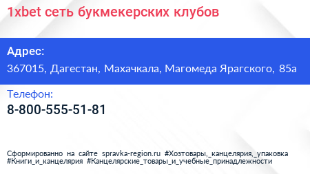 1xbet, сеть букмекерских клубов по адресу 367015, Дагестан, Махачкала, Магомеда Ярагского, 85а в дальнейшем Организация, размещена в следующих категориях:
