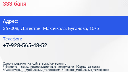 333, баня по адресу 367008, Дагестан, Махачкала, Буганова, 10/5 в дальнейшем Организация, размещена в следующих категориях:
