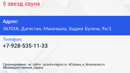 5 звезд, сауна по адресу 367018, Дагестан, Махачкала, Хаджи Булача, 9а/1 в дальнейшем Организация, размещена в следующих категориях: