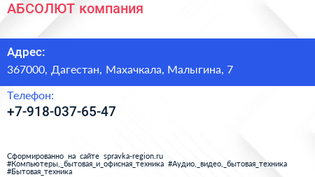 АБСОЛЮТ, компания по адресу 367000, Дагестан, Махачкала, Малыгина, 7 в дальнейшем Организация, размещена в следующих категориях: