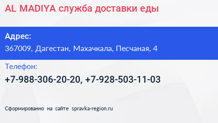 AL-MADIYA, служба доставки еды по адресу 367009, Дагестан, Махачкала, Песчаная, 4 в дальнейшем Организация, размещена в следующих категориях: