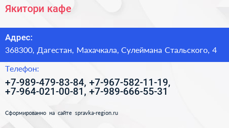 Якитори, кафе по адресу 368300, Дагестан, Махачкала, Сулеймана Стальского, 4 в дальнейшем Организация, размещена в следующих категориях: