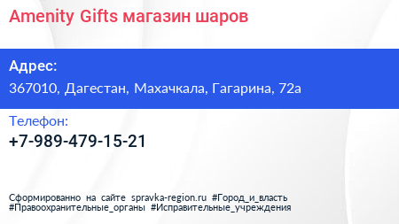 Amenity Gifts, магазин шаров по адресу 367010, Дагестан, Махачкала, Гагарина, 72а в дальнейшем Организация, размещена в следующих категориях: