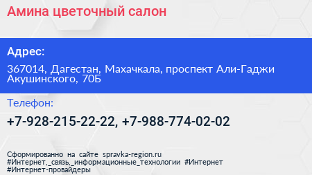 Амина, цветочный салон по адресу 367014, Дагестан, Махачкала, проспект Али-Гаджи Акушинского, 70Б в дальнейшем Организация, размещена в следующих категориях: