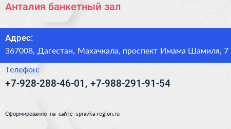 Анталия, банкетный зал по адресу 367008, Дагестан, Махачкала, проспект Имама Шамиля, 7 в дальнейшем Организация, размещена в следующих категориях: