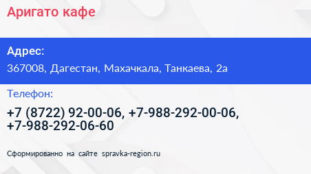 Аригато, кафе по адресу 367008, Дагестан, Махачкала, Танкаева, 2а в дальнейшем Организация, размещена в следующих категориях: