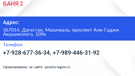 БАНЯ №2 по адресу 367014, Дагестан, Махачкала, проспект Али-Гаджи Акушинского, 109к в дальнейшем Организация, размещена в следующих категориях: