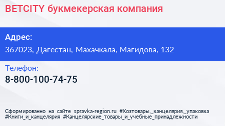BETCITY, букмекерская компания по адресу 367023, Дагестан, Махачкала, Магидова, 132 в дальнейшем Организация, размещена в следующих категориях: