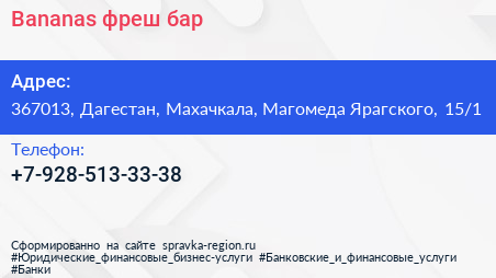 Bananas, фреш-бар по адресу 367013, Дагестан, Махачкала, Магомеда Ярагского, 15/1 в дальнейшем Организация, размещена в следующих категориях:
