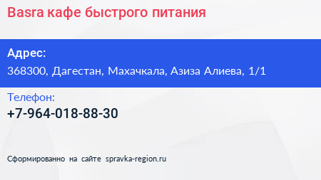 Basra, кафе быстрого питания по адресу 368300, Дагестан, Махачкала, Азиза Алиева, 1/1 в дальнейшем Организация, размещена в следующих категориях: