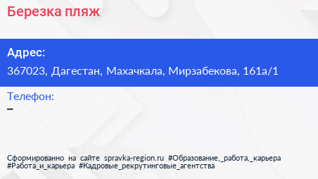 Березка, пляж по адресу 367023, Дагестан, Махачкала, Мирзабекова, 161а/1 в дальнейшем Организация, размещена в следующих категориях: