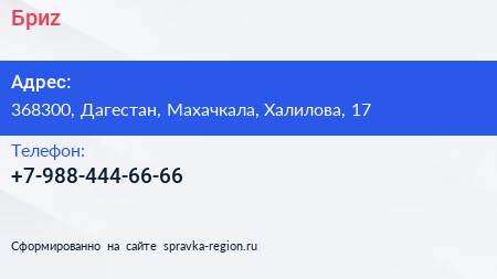 Бриz по адресу 368300, Дагестан, Махачкала, Халилова, 17 в дальнейшем Организация, размещена в следующих категориях: