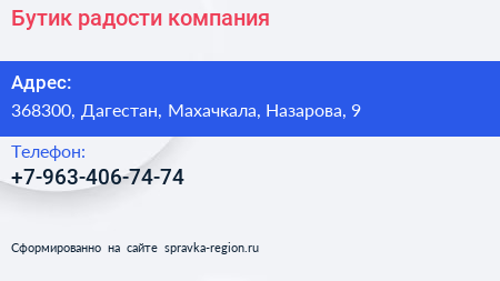 Бутик радости, компания по адресу 368300, Дагестан, Махачкала, Назарова, 9 в дальнейшем Организация, размещена в следующих категориях: