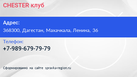 CHESTER, клуб по адресу 368300, Дагестан, Махачкала, Ленина, 36 в дальнейшем Организация, размещена в следующих категориях: