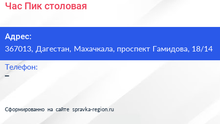 Час Пик, столовая по адресу 367013, Дагестан, Махачкала, проспект Гамидова, 18/14 в дальнейшем Организация, размещена в следующих категориях: