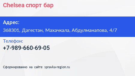 Chelsea, спорт-бар по адресу 368301, Дагестан, Махачкала, Абдулманапова, 4/7 в дальнейшем Организация, размещена в следующих категориях: