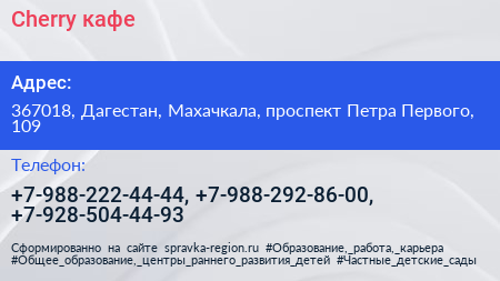 Cherry, кафе по адресу 367018, Дагестан, Махачкала, проспект Петра Первого, 109 в дальнейшем Организация, размещена в следующих категориях: