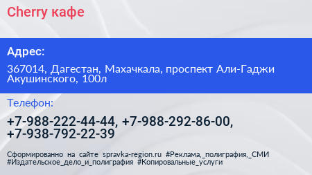 Cherry, кафе по адресу 367014, Дагестан, Махачкала, проспект Али-Гаджи Акушинского, 100л в дальнейшем Организация, размещена в следующих категориях: