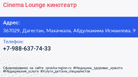 Cinema Lounge, кинотеатр по адресу 367029, Дагестан, Махачкала, Абдулхакима Исмаилова, 9 в дальнейшем Организация, размещена в следующих категориях: